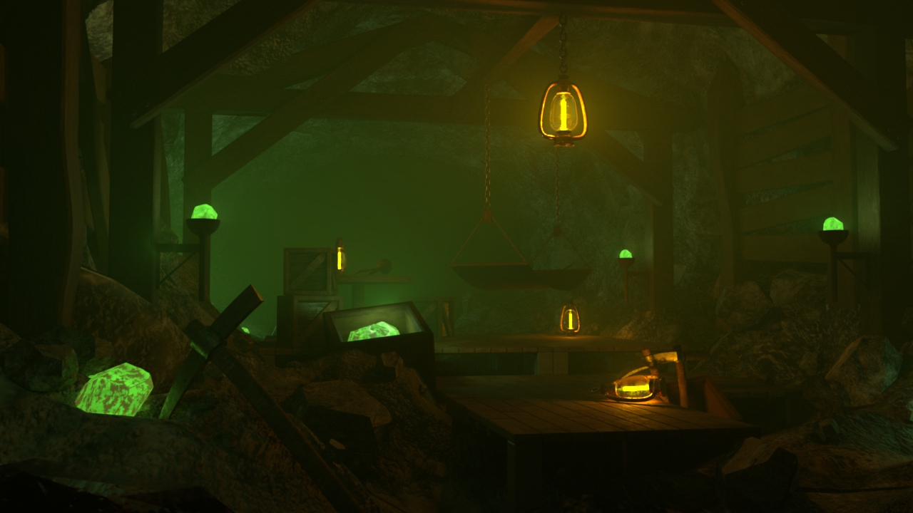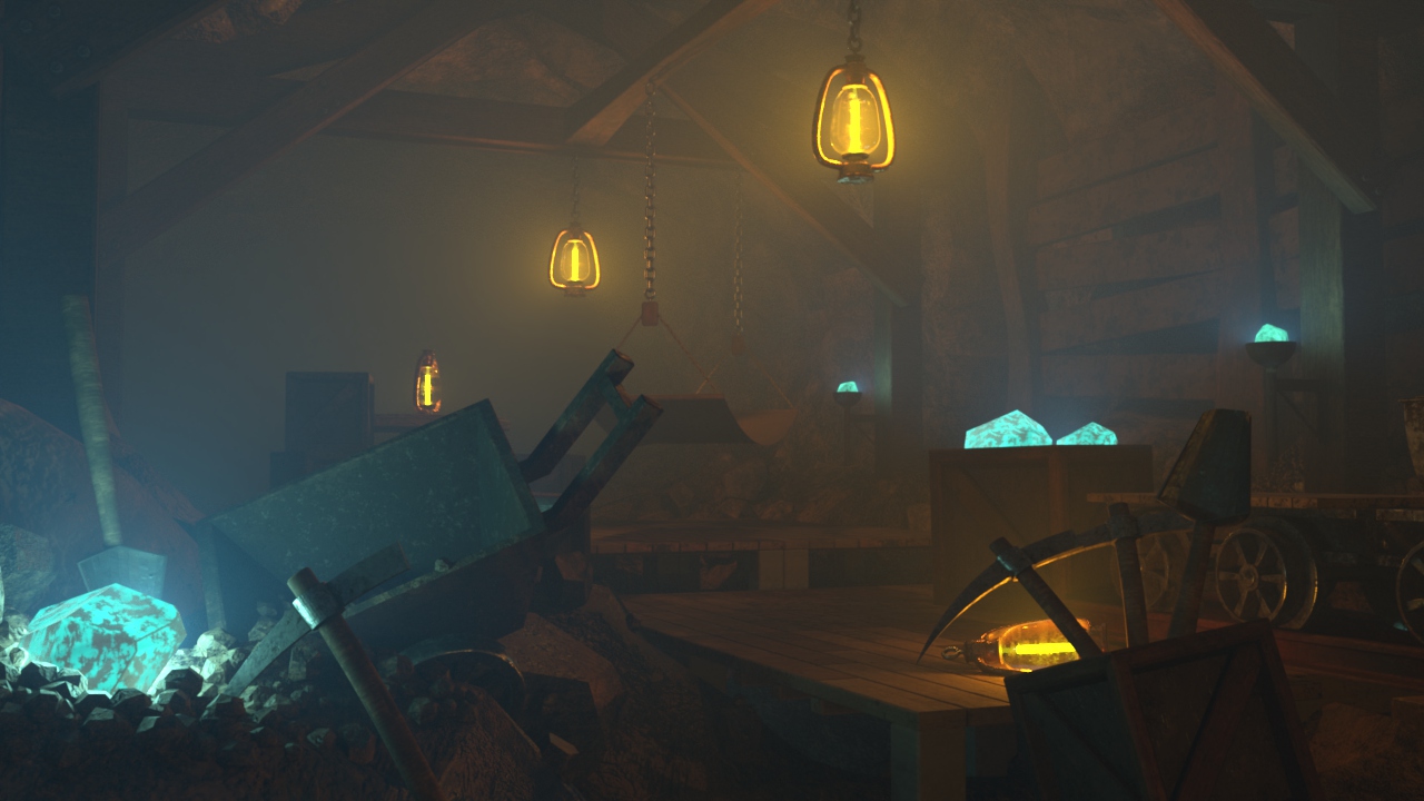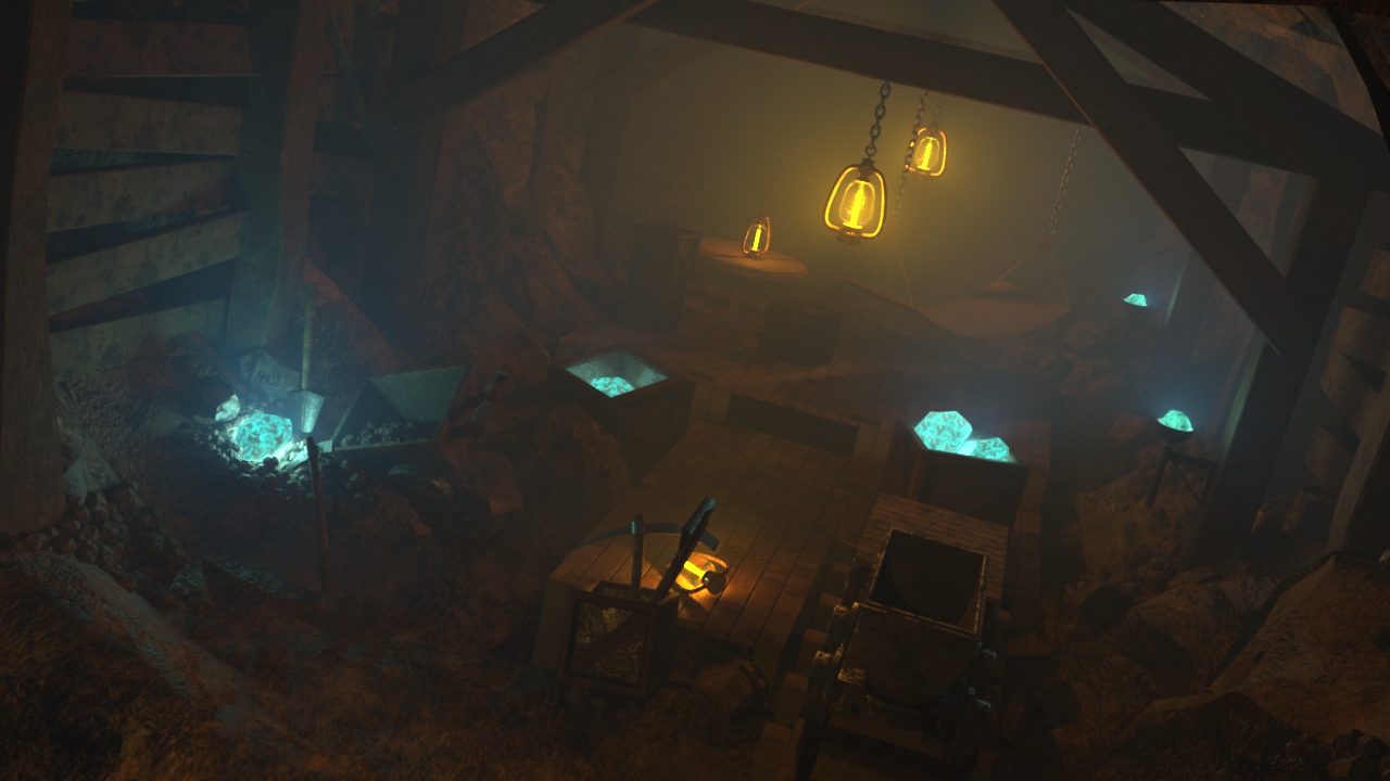 室内というテーマでの制作だったのですが、人工物と自然物が混ざっている空間を作成したく、 洞窟を利用した生活感のある場所というコンセプトでスタートしました。 一方で、配置するオブジェクトについては作りながら決定しました。 最終的に鉱山という設定にした理由は、ライトを多く設置することでクオリティを向上させる必要があり、 光の演出に違和感のない環境を整えるためです。