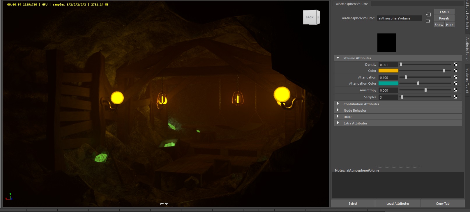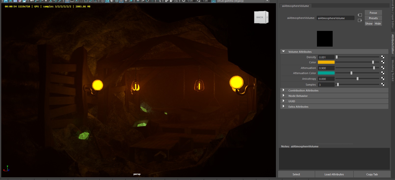 Attenuationが0.9がこちら。 aiAtmosphereVolume によるライトの拡散効果は、調整は難しいですがシーンの情報量を増やしつつ、生っぽさを抑える点で大きな役割を果たしています。