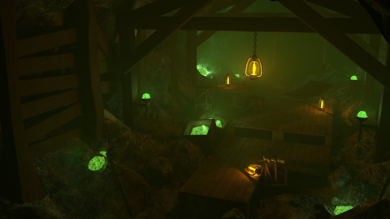 洞窟内の情報量を増やすために、ランプ等の明かりがたくさん配置し、複数色の光源を用意するように意識しました。 設定としては、光る鉱石が取れる鉱山の中にある小さな拠点で文明レベルは低め、ランタンも別の光る鉱石を利用しています。 木と石と岩の組み合わせ、床部分は人工物多め、天井部は自然地形感があるようにしました。