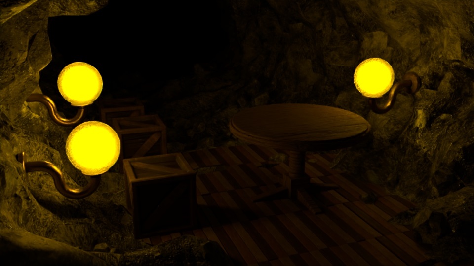 洞窟モデル上にテーブル・ランプ・木箱・床を仮配置した状態です。ランプが大きすぎたりとスケール感はバラバラです。